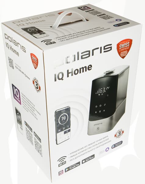Также на упаковке мы видим логотипы Google Play и App Store (мобильное приложение Polaris разрабатывается для обеих платформ), иконки экосистемы IQ Home и голосовых помощников «Алисы» и «Маруси»: устройство поддерживает помощников Яндекса и Mail.Ru. Помимо этого, на лицевой стороне упомянуты (это обязательно для Polaris) производство под контролем швейцарской компании и трехгодичная гарантия на устройство. На боках размещены подробные технические характеристики прибора и QR-коды для загрузки приложения.