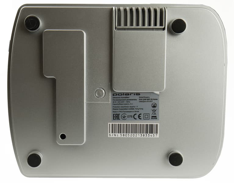 Устройство опирается на четыре прорезиненные ножки — они предотвращают скольжение. На нижней панели, с правой стороны корпуса, есть воздухозаборное отверстие, ведущее в емкость для ароматических веществ.