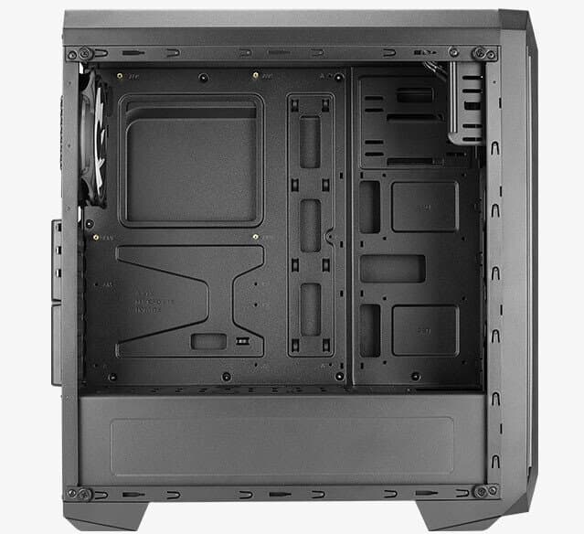 Внутри корпус имеет привычную компоновку с нижним отсеком для блока питания и двух накопителей типоразмера 3,5 или 2,5 дюйма. В верхнем отсеке достаточно места для системной платы, двух накопителей типоразмера 2,5 дюйма и семи карт расширения длиной до 380 мм. Максимально допустимая высота процессорной системы охлаждения — 155 мм, длина блока питания — 178 мм.