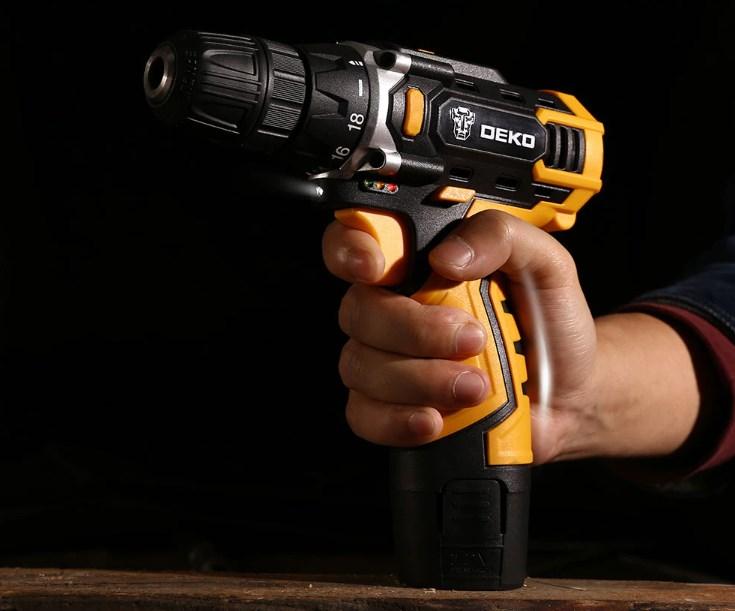 И открывает подборку модель шуруповерта от достаточно известного китайского бренда Deko. Плюсом этой компании является то, что они имеют свои склады во многих странах, в том числе и РФ. Также их продукция отличается приемлемой ценой, хорошей комплектацией и отличным качеством. Данная модель имеет компактные размеры и питается от сменных аккумуляторов на 12 V с высокой электроемкостью. Также на ваш выбор есть модели с более мощным двигателем и аккумулятором. В зависимости от выбранной вами модели шуруповерт выдает крутящий момент на уровне 28, 32 или 42 N.m