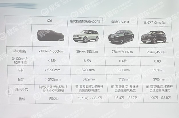 Источник опубликовал подробности о полноразмерном внедорожнике Ideal X01, который должен составить конкуренцию с Range Rover Extended Edition 400PS, Mercedes-Benz GLS 450 и BMW X7 XDrive40i. Именно с этими автомобилями производитель сравнивает его на утекшем слайде.