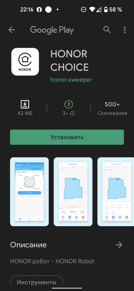 Для управления пылесосом используется совсем свежее приложение Honor Choice (более 500 скачиваний на момент создания обзора).