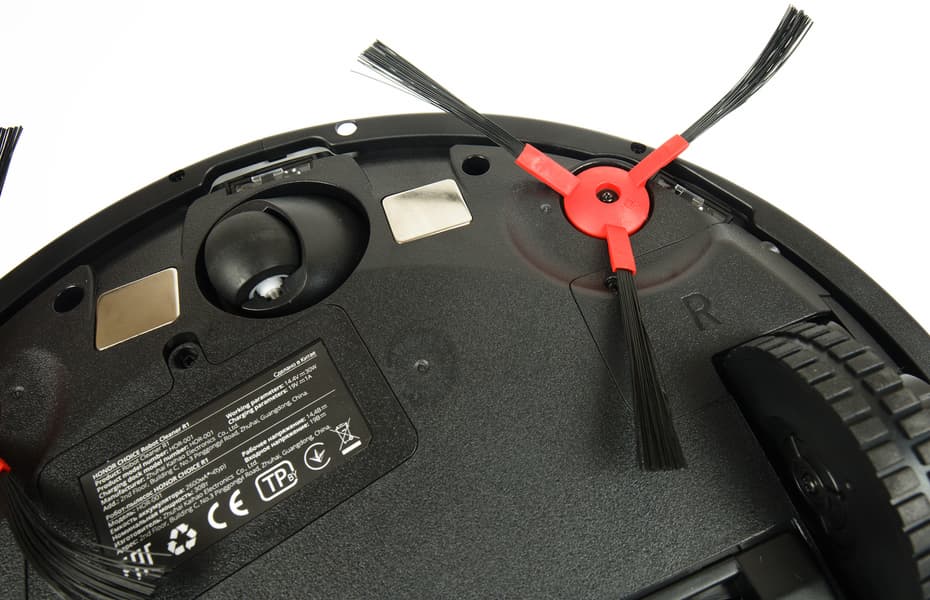 Направляющее колесо расположено в передней части нижней панели. Оно смонтировано в пластиковой сфере и способно вращаться на 360°. С боков от колеса — два контакта, с помощью которых устройство заряжается на базе.