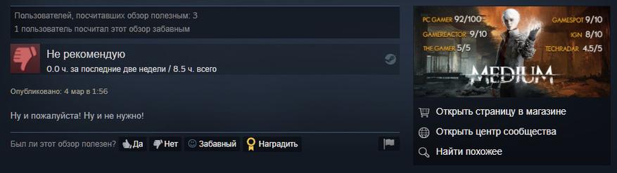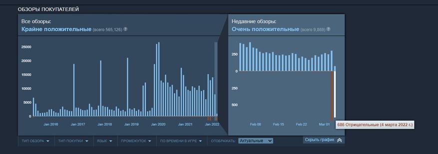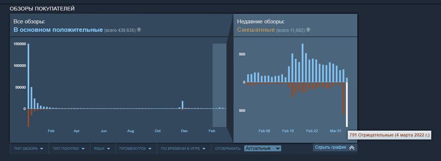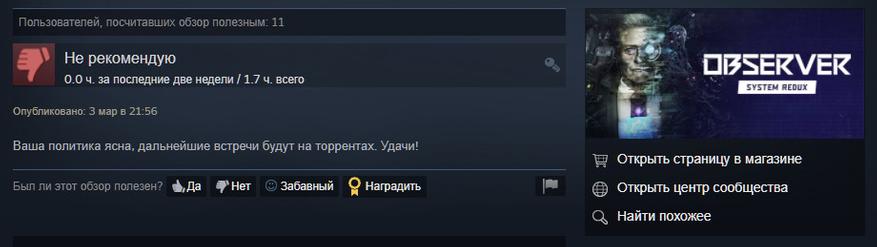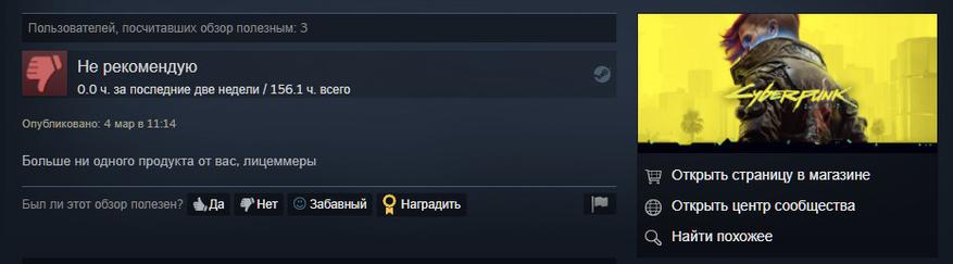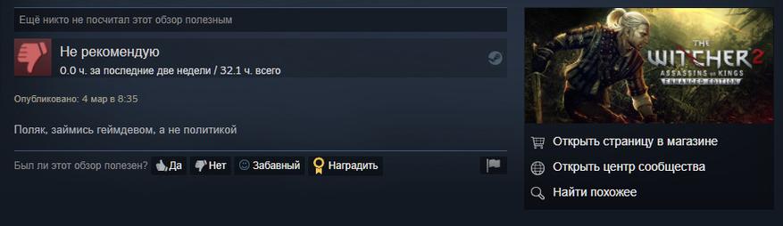 Российские игроки Steam организовали массовый ревью-бомбинг на игры польской компании CD Projekt Red после того, как последняя сообщила накануне об остановке продаж своих продуктов на территории России и Беларуси.