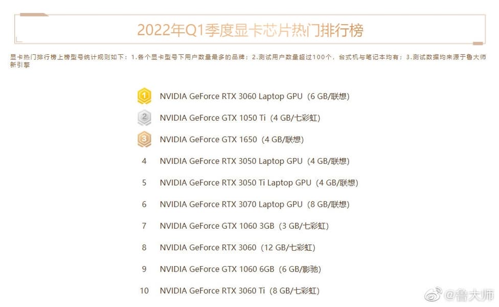 Разработчики популярного в Китае тестового приложения Master Lu опубликовали исследование китайского рынка дискретных 3D-ускорителей в первом квартале ткущего года. Первое место закрепил за собой Nvidia GeForce RTX 3060. Правда, тут есть нюанс: на первом месте – мобильная версия, для ноутбуков. Настольная GeForce RTX 3060 тоже есть в топ-10, но только на восьмом месте.