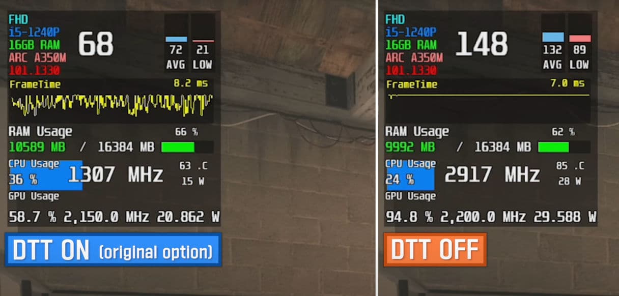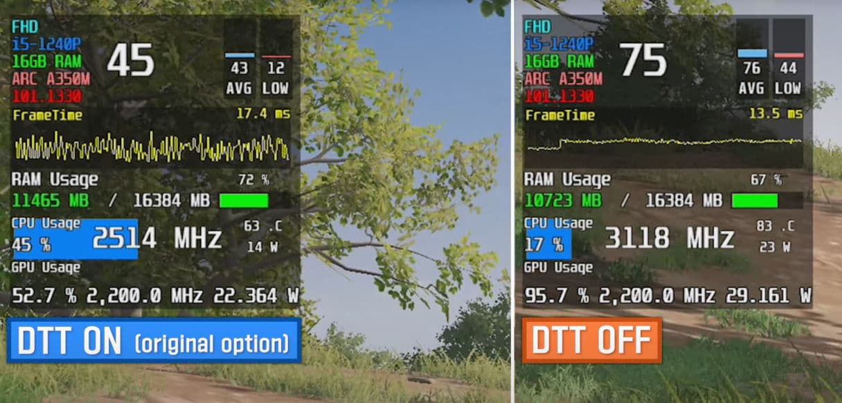 Один из владельцев новенького ноутбука Samsung с Arc A350M обнаружил, что отключение технологии Intel Dynamic Tuning Technology приводит к колоссальному росту производительности. Речь идёт примерно о 100%, а порой и более!