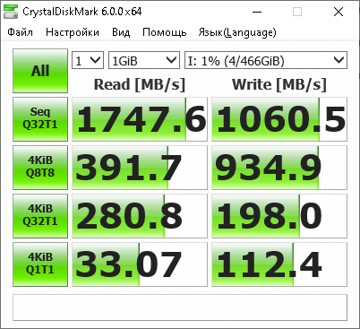 Для пробного тестирования мы взяли SSD Seagate BarraCuda Q5 емкостью 500 ГБ. Нагрузку на этот накопитель мы создавали с помощью синтетического теста CrystalDiskMark 6. Настройки видны на снимке с экрана: