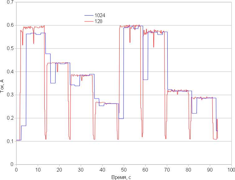 В случае усреднения по 128 выборкам отчетливо видна пауза в одну секунду между тестами, но принципиальных отличий от варианта с усреднением по 1024 выборкам нет, максимальные значения тока в тестах примерно такие же.