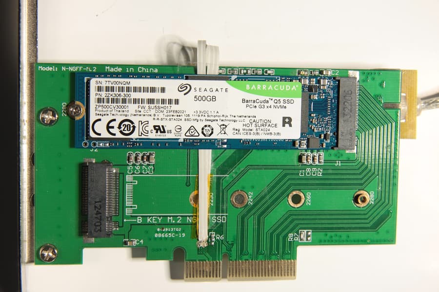 В подобных случаях обычно выручают разного рода адаптеры или переходники, в которых линии питания проще выделить и вывести на измеритель тока и напряжения. В данном случае мы воспользовались платой-переходником с двух разъемов M.2 на разъем PCIe x4. На этой плате три дорожки питания 3,3 В от разъема PCIe объединяются в одну широкую дорожку, в разрыв которой уже можно вставить токоизмерительный шунт. Разъемы M.2 на плате разные: один с ключом типа B (только для накопителей с интерфейсом SATA) и один с ключом типа M (только для накопителей с интерфейсом PCIe). Для измерений мы используем второй разъем.
