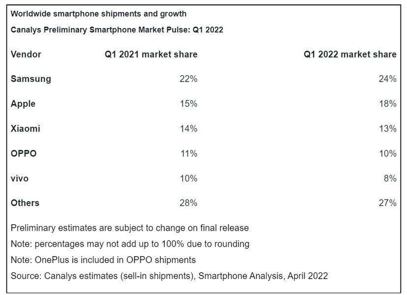 Несмотря на спад продаж, Samsung и Apple смогли нарастить свои доли. Корейский гигант лидирует с долей 24% против 22% годом ранее, а купертинский гигант благодаря успеху линейки iPhone 13 продолжает удерживать второе место с долей 18% против 15% год назад.
