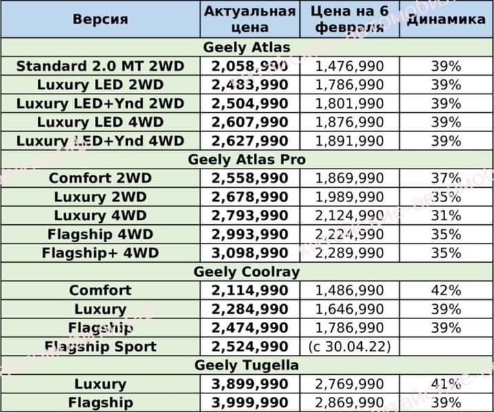 Профильное издание «Китайские автомобили» свело все цены в одну таблицу, в которой указано, сколько автомобили стоили в феврале и какая цена на них сейчас. Сильнее всего подорожали Geely Coolray (+42%) и Geely Tugella, который прибавил 41%. Geely Atlas Pro подорожал меньше остальных, но разница всё равно получилась ощутимой.
