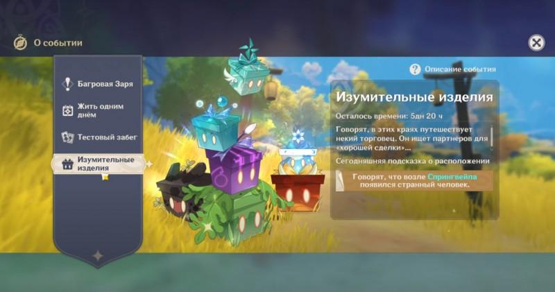 Но не только компенсацией и продолжительным баннером топового персонажа нас порадуют разработчики. Так же они запустят некоторые инвенты, которых, очевидно, в планах не было. Во-первых, уже сегодня (если я не ошибаюсь), появится всеми любимое событие под названием «Изумительные изделия». Нам нужно будет отыскать торговца Ли Бэня и забрать у него щедрую награду. Событие продлится вплоть до 13 мая. Награду будем забирать у него ежедневно на протяжении всего ивента.