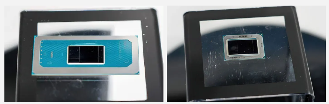 На фото можно видеть два разных процессора, при этом это не разные модели, а кристаллы с разной плотностью компоновки. При этом каких-то подробностей по этому поводу нет, так что неясно, зачем Intel работает над двумя вариантами и какой с большей долей вероятности пойдёт в производство.
