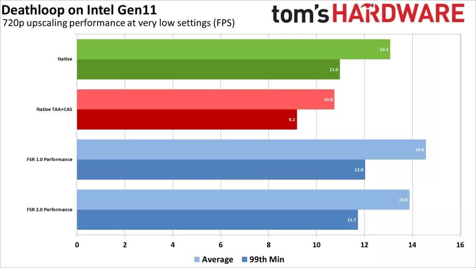 В Сети уже появилось тестирование в игре Deathloop, которая первой получила поддержку FSR 2.0. И тестировали авторы ноутбуки с GPU Intel. Правда, прошлых поколений. Одна модель была основана на Core i7-1165G7 и Intel Xe, а другая располагала ещё более старым Core i7-1065G7. Несмотря на то, что сама игра предупредила, что 3D-карты Intel не поддерживаются, всё заработало.