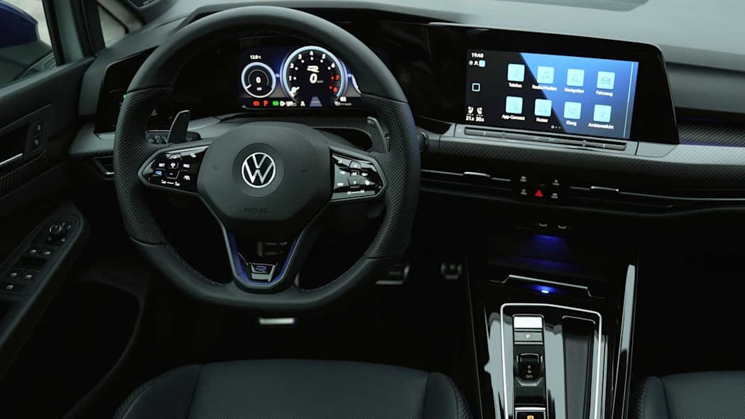 Такие же логотипы есть в салоне, при этом Volkswagen Golf R 20 Years стал первым серийным автомобилем компании, который получил переднюю панель и дверные карты из настоящего карбона.