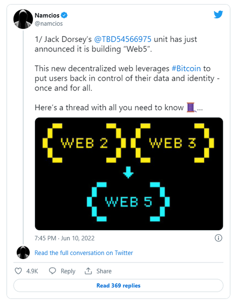 В то время как Web3 включает в себя технологию блокчейна и токенизацию для децентрализации Интернета, Web5 рассматривается как система, основанная на идентификации, использующая только один блокчейн: Биткойн. Пользователь Twitter Намсиос (Namcios) разбил концепцию Web5 в серии твитов, в которых описывались несколько программных компонентов, которые работают вместе, чтобы улучшить взаимодействие с пользователем и обеспечить децентрализованное управление идентификацией.
