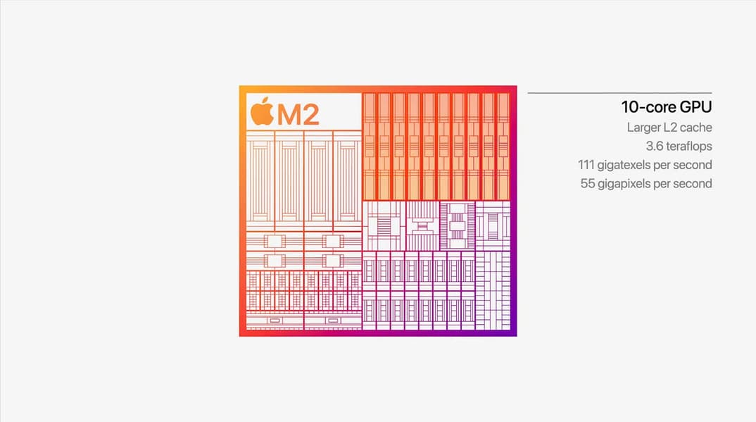 Восьмиядерный CPU платформы представлен четырьмя высокопроизводительными ядрами с 16 МБ общей кэш-памяти и четырьмя энергоэффективными с 4 МБ общего кэша. 10-ядерный GPU получил больше кэш-памяти, чем у GPU M1, а его производительность – 3,6 TFLOPS.