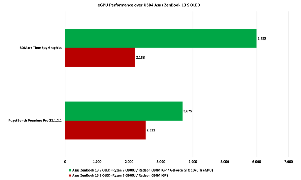 К ноутбуку подключалась внешняя док-станция ASUS XG Station Pro с 3D-картой GeForce GTX 1070 Ti и поддержкой интерфейса Thunderbolt 3. Результаты хорошо видны на диаграмме: настольный 3D-ускоритель, подсоединенный через быстрый интерфейс, обеспечивает прибавку в производительности в 2,7 раза относительно iGPU Radeon 680M в 3DMark. Естественно, если подключить видеокарту посовременнее, например, GeForce RTX 3070, то прибавка по части графики будет больше.