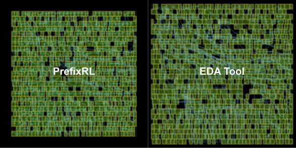 PrefixRL способен с нуля создавать арифметические схемы, причём они меньше и быстрее того, что создаётся классическими инструментами. Nvidia говорит, что архитектура Hopper содержит почти 13 000 экземпляров таких схем, разработанных PrefixRL.