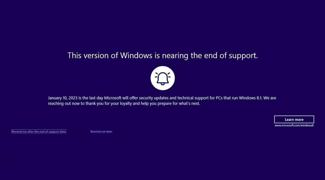 Компания Microsoft готовится к прекращению поддержки операционной системы Windows 8.1. Хотя это произойдёт только 10 января 2023 года, до этого момента система будет выдавать сообщения о скором прекращении выпуска обновлений и станет предлагать переход на более новую ОС.