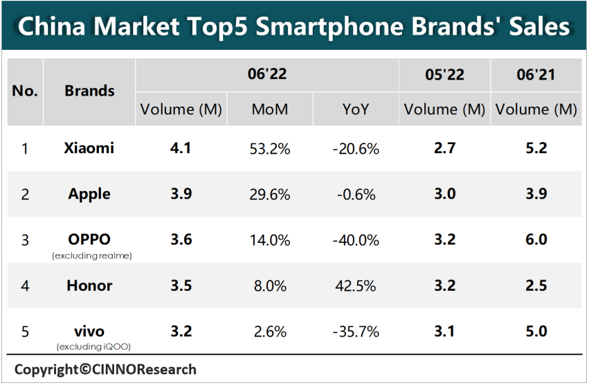 Аналитики CINNO оценили рынок смартфонов Китая за месяц (июнь), квартал и полугодие.