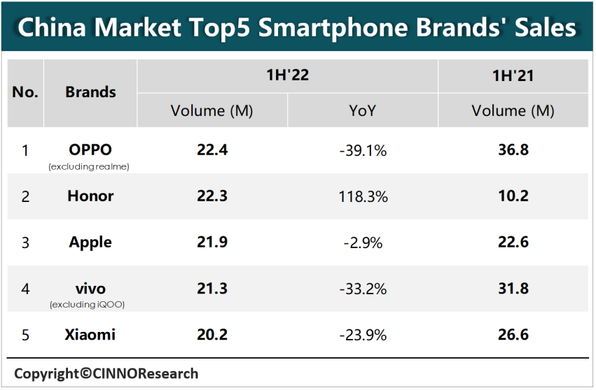 В рамках полугода хорошо видно, что Honor продолжает победоносное шествие по родному рынку, сжирая конкурентов. Компания смогла продать 22,3 млн смартфонов, нарастив продажи более чем вдвое и обойдя даже Apple. От лидера в лице Oppo её отделяло лишь около 100 000 смартфонов. Для сравнения: годом ранее Honor отставала от Oppo более чем втрое.