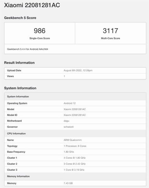 В бенчмарке Geekbench засветилось новое устройство Xiaomi с каталожным номером 22081281AC. Источник ассоциирует этот номер с готовящемся к выходу планшетным компьютером Redmi Pad 5G.