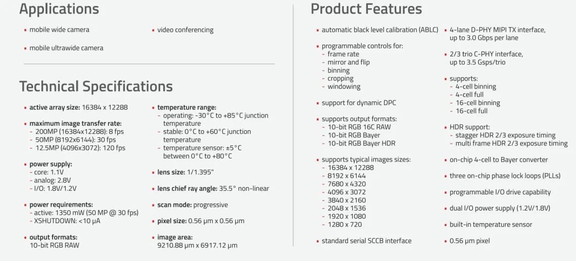 Датчик поддерживает 16-ячеечный биннинг, так что фотографии получаются с разрешением 12,5 Мп. Видео можно снимать в 4K при 120 к/с, поддерживается и 8K при 30 к/с. Датчик должен появиться в смартфонах в четвёртом квартале.
