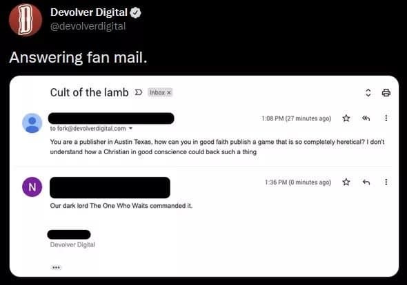 Несколько дней назад состоятся релиз инди-игры Cult of the Lamb, в которой одержимый ягнёнок создаёт свой культ и борется с врагами своей религии. Игра получила высокие оценки от критиков и игроков, а издательству Devolver Digital пришло на электронную почту интересное письмо.