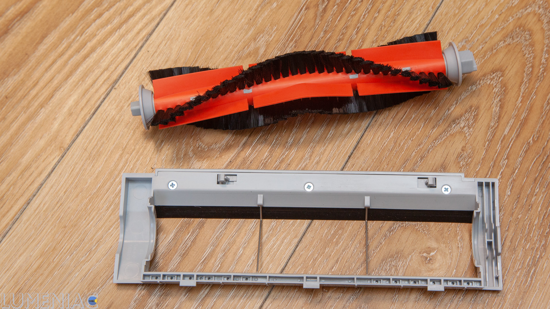 Есть обязательная боковая трехлучевая крутящаяся щетка, которая сгребает мусор в красную пасть основной турбощётки.