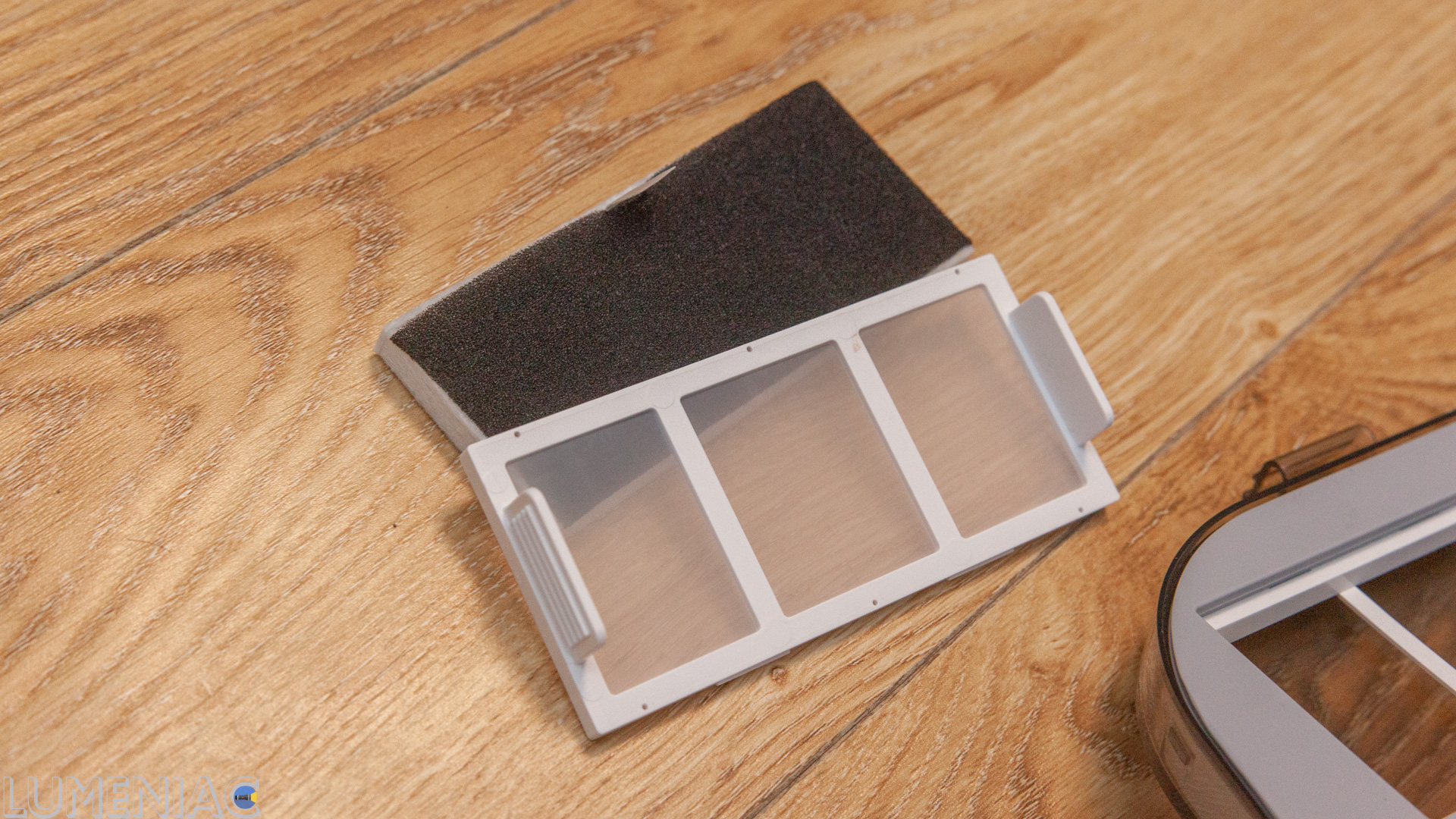 Видите два выступа по бокам белого прямоугольника в крышке? Потяните их и вы снимете бутерброд из HEPA и обычного поролонового фильтров. Кстати да, сама крышка тоже фильтр, тонкий нейлоновый. Получается добротный 3х-слойный фильтр.