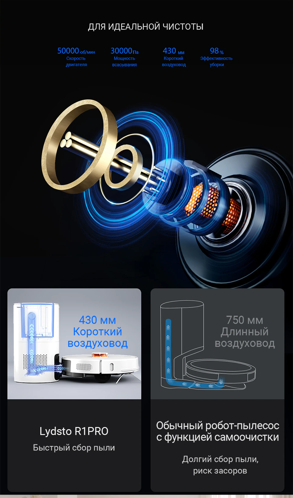 Lydsto R1 Pro отличается от R1 увеличенной на 5% мощностью и улучшенной системой навигации.