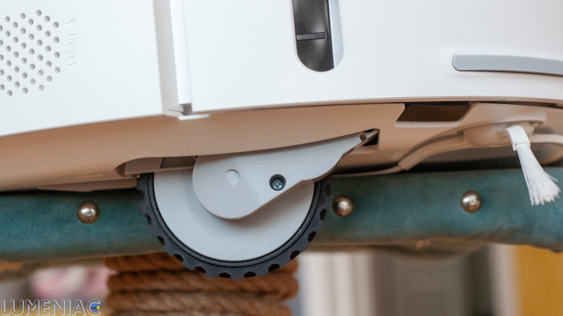 У колёс немаленький изменяемый клиренс, от 8 до 42мм. Как обычно, есть и датчик падения. Если одно колесо свесилось со ступеньки, робот-пылесос это отследит.