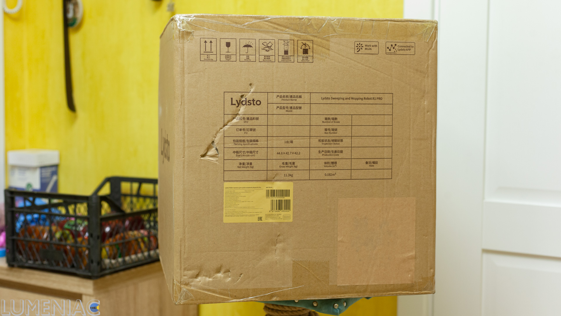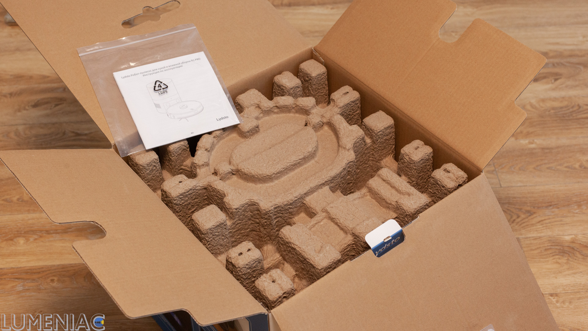 Внутри в толстом слое прессованного картона и лежит робот пылесос Lydsto R1 Pro с зарядной станцией.