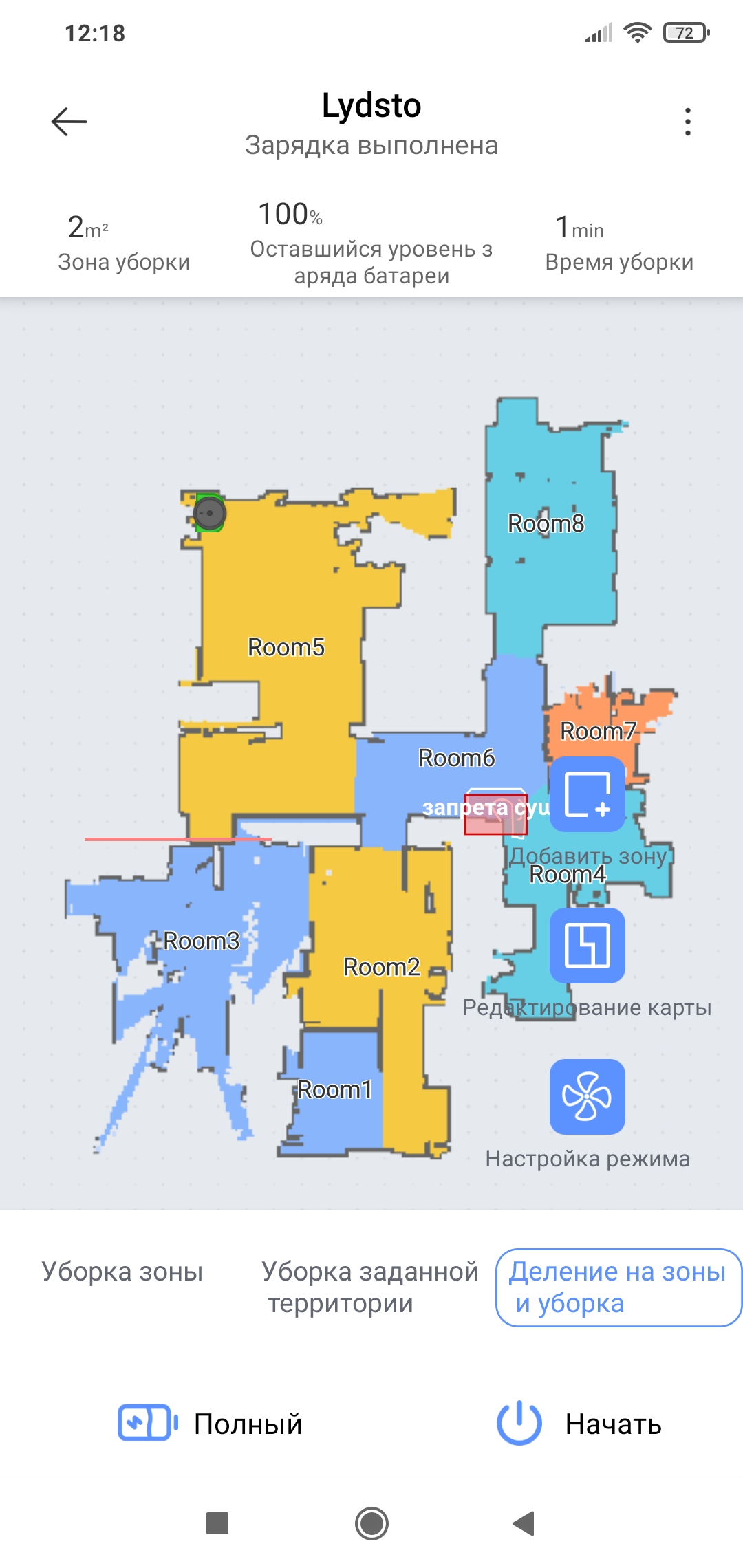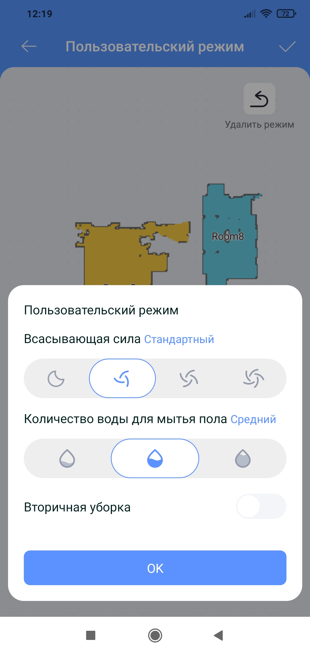 Если щелкнуть на пользовательский режим, то для каждой комнаты можно задать свою силу всасывания и расход воды. Комнаты можно редактировать, разделять и объёдинять. Собственно, красная черта на карте это и есть та самая виртуальная стена.