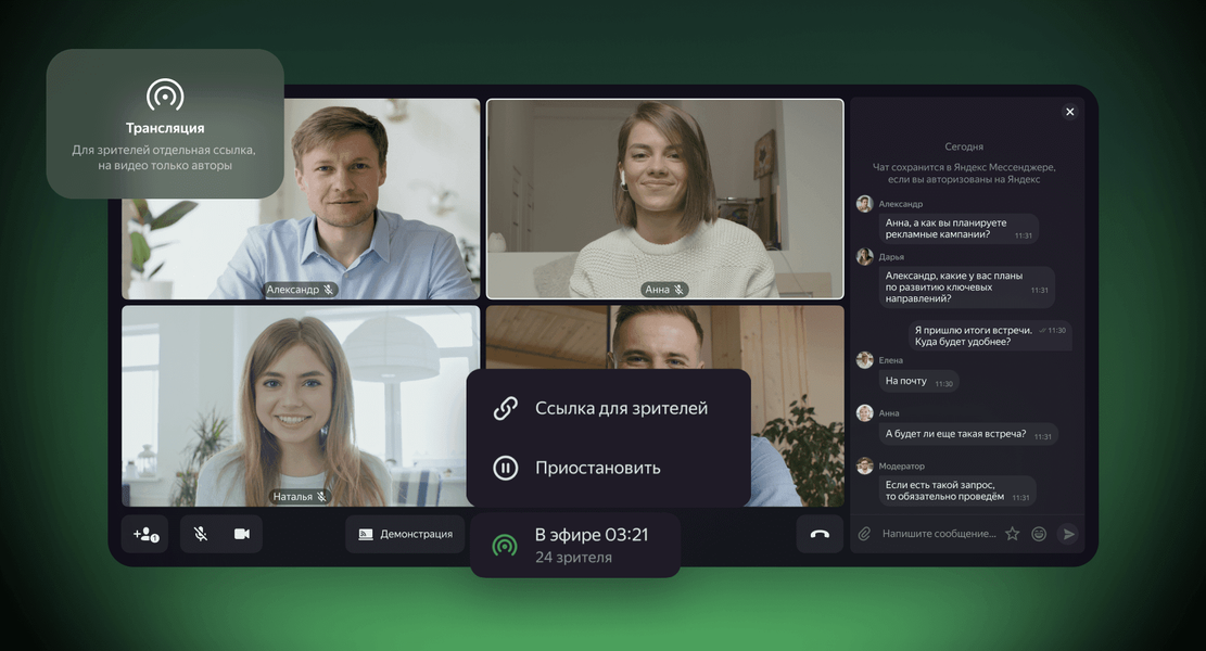 В сервисе видеовстреч «Телемост» появилась возможность вести трансляции. Как отмечают разработчики, с их помощью удобно проводить лекции, вебинары, презентации для клиентов и другие мероприятия. Число зрителей может достигать 10 000.