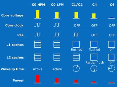 - C6, при котором отключено и обесточено почти всё — даже из 203 выводов питания активны лишь 21, уменьшая утечки в 10 раз, а потребление — до 100 мВт (по некоторым данным в новых ЦП Z-серии — до 30 мВт).