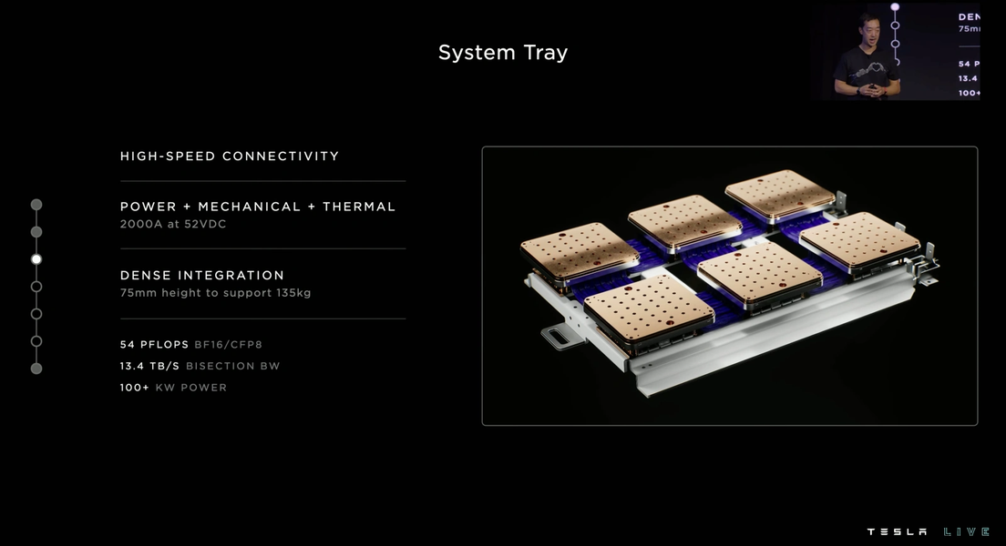 Tesla утверждает, что может заменить 6 блоков графических процессоров одной плиткой (Dojo tile), которая, по утверждению компании, стоит меньше, чем один блок графических процессоров. На лотке (system tray) 6 таких плиток. Один лоток эквивалентен «3-4 полностью загруженным стойкам для суперкомпьютеров». Tesla может разместить два таких системных лотка в одном корпусе Dojo. Tesla все еще разрабатывает и тестирует инфраструктуру, необходимую для объединения нескольких шкафов для создания первого Dojo ExaPOD, основные характеристики которого уже известны: 1,1 EFLOP, 1,3 ТБ SRAM и 13 ТБ DRAM с высокой пропускной способностью.