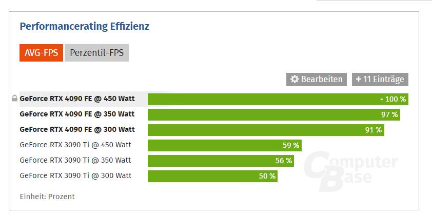 GeForce RTX 4090 оказалась вдвое энергоэффективнее своей предшественницы и потребляет в играх в среднем лишь около 350 Вт. Наши коллеги с Computerbase решили проверить, что случится, если снизить лимит мощности карты с изначальных 450 Вт до 350 Вт или даже до 300 Вт.