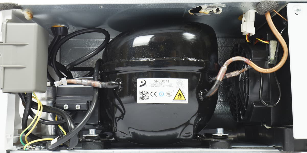 В нижней части тыльной панели размещается ниша холодильного агрегата. В конструкции Lex RBI 101 DF использован малогабаритный компрессор CR60CY1, смонтированный, как полагается, на круглых резиновых амортизаторах, смягчающих вибрацию.
