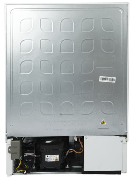Боковые стенки лишены даже выштамповки. Таковая есть только на неокрашенной металлической задней поверхности. Как и у большинства встраиваемой холодильной техники, теплообменник здесь убран внутрь корпуса.