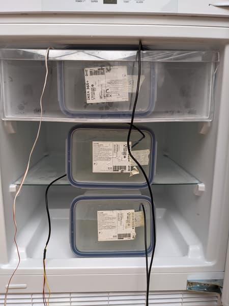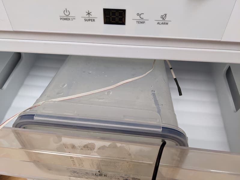 Габариты контейнеров не позволили нам разместить их в нижнем и среднем ящиках морозилки, поэтому мы поместили их на полки, а ящики сняли. Одновременно с замерами температуры воды мы фиксировали и температуру воздуха на каждой полке.