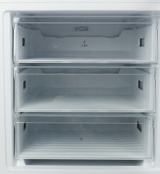 В единственном отделении морозилки — три полки, на которые можно ставить пластиковые ящики одинакового размера. Прозрачность их «лиц» позволяет видеть содержимое, не выдвигая контейнеры. Боковые и задние стенки емкостей — из белой пластмассы.