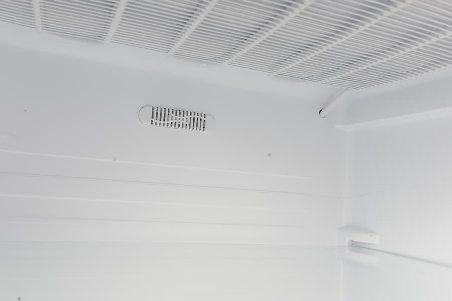 Над верхней перегородкой располагается испаритель, окрашенный белой эмалью. На задней стенке рядом с ним — решетка климатического датчика.