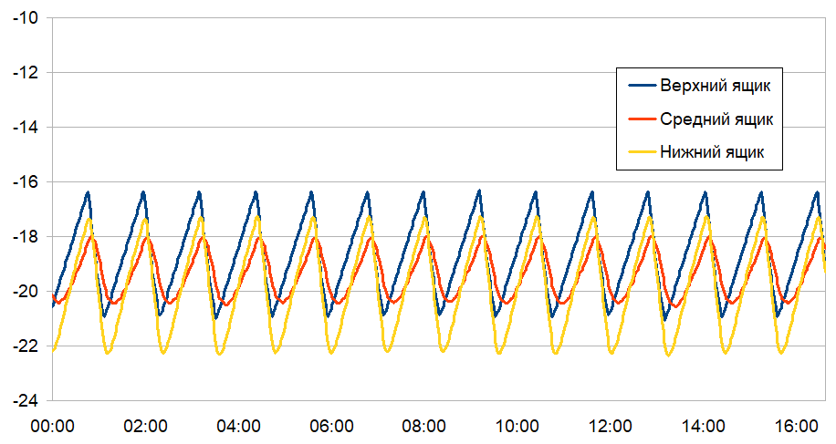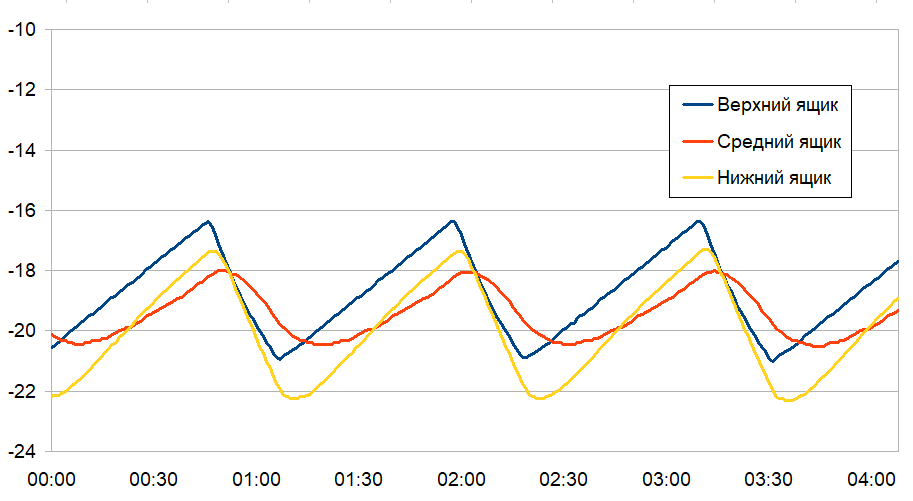 При установленной на панели управления температуре 19 °C средняя температура в верхнем ящике составляет приблизительно −19,0 °C, в среднем — −18,4 °C, а холоднее всего в нижнем контейнере — примерно −19,3 °C. Рассмотрим наш график поближе.