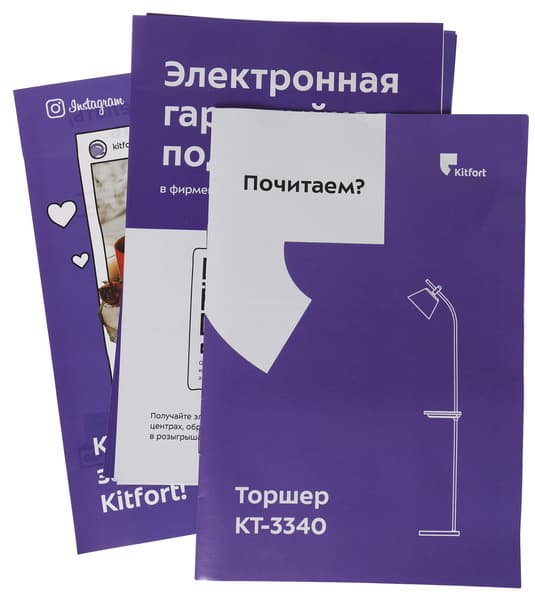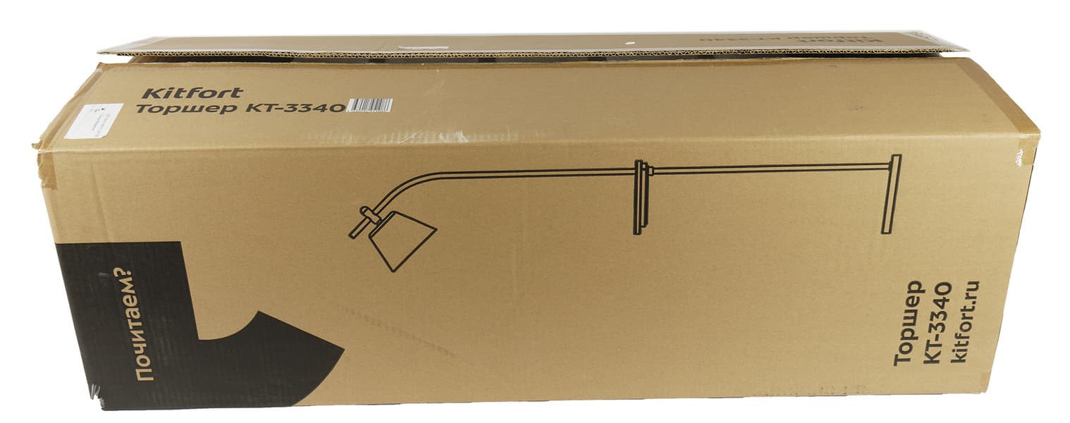Торшер прибыл к нам в большой прямоугольной коробке с узнаваемым фирменным оформлением Kitfort. На упаковке из прочного коричневого картона размещена краткая информация о приборе, полное название модели и логотип компании.