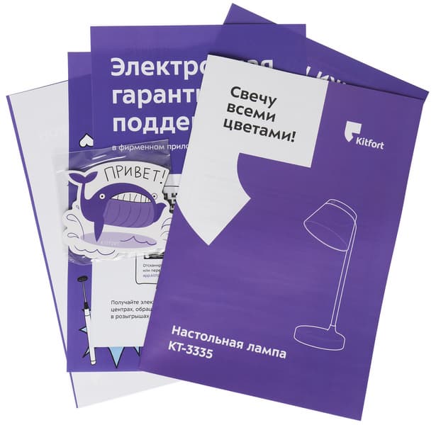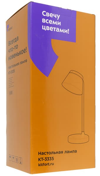 Kitfort KT-3335 поставляется в небольшой картонной коробке с узнаваемым фирменным оформлением. На лицевой и обратной сторонах упаковки — схематическое изображение светильника, логотип компании, полное название модели и обязательный слоган, на этот раз указывающий на одну из главных особенностей лампы — «Свечу всеми цветами!». На боковых гранях размещены краткие технические характеристики. Сверху есть пластиковая ручка для переноски.