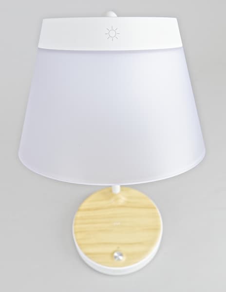 Белый матовый металл основания и штанги ровно, как и матовый белоснежный пластик рассеивателя отлично сочетаются с пластиковой имитацией под светлое дерево круглой панели управления.