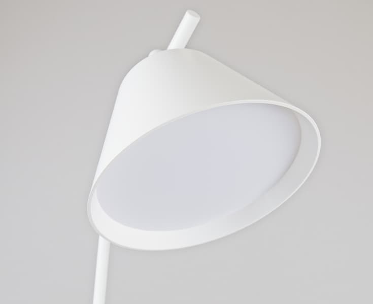 Металлическая белая штанга, поднимающаяся из основания на конце, сгибается и держит рассеиватель под углом 45 градусов. Сенсорная кнопка включения RGB-подсветки располагается в верхней части рассеивателя на лицевой стороне.