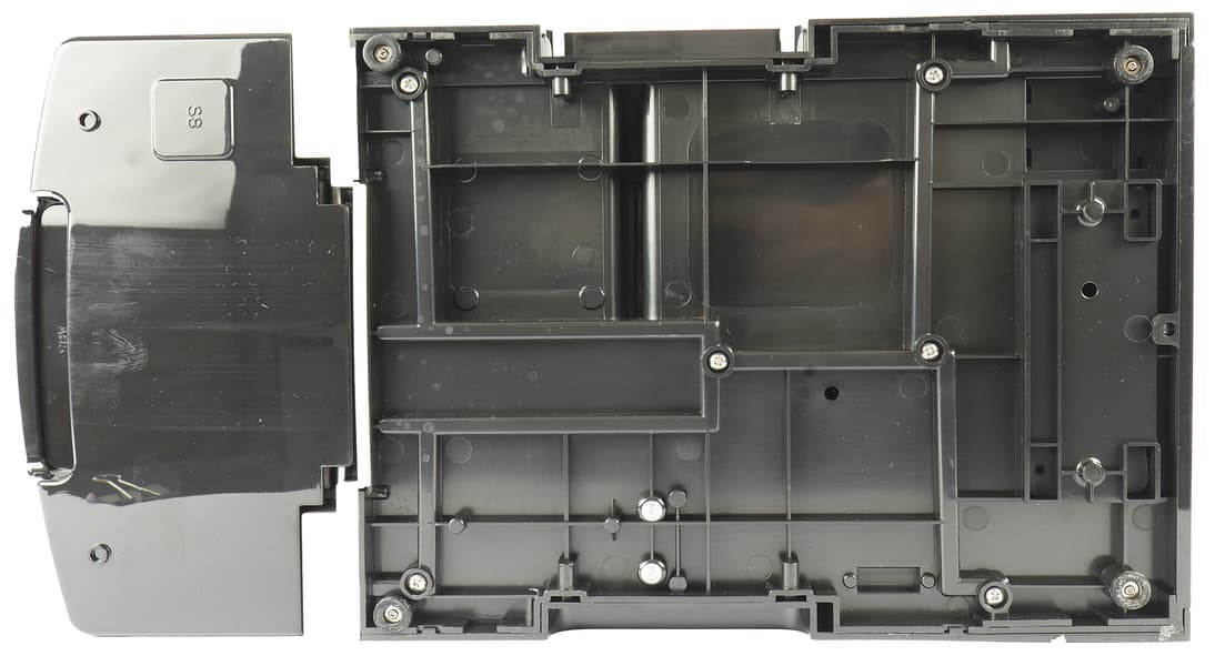 В верхней части корпуса находятся крышки отсека для зерен из черного пластика и крышка бака для воды (также из черного пластика).